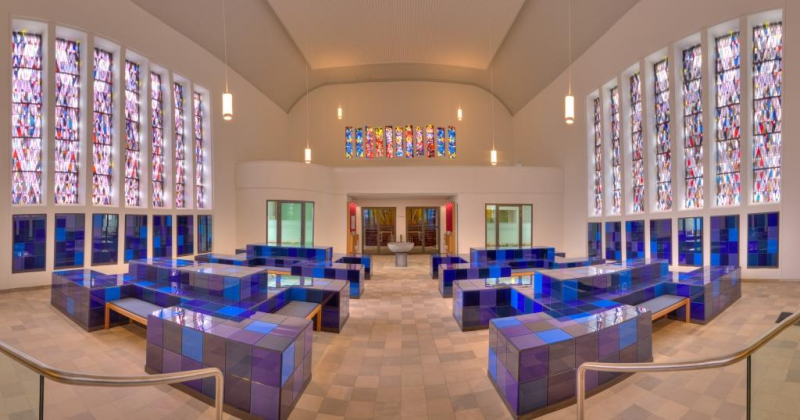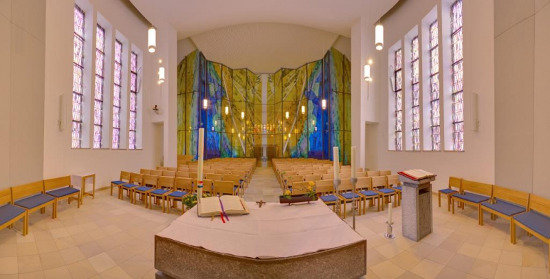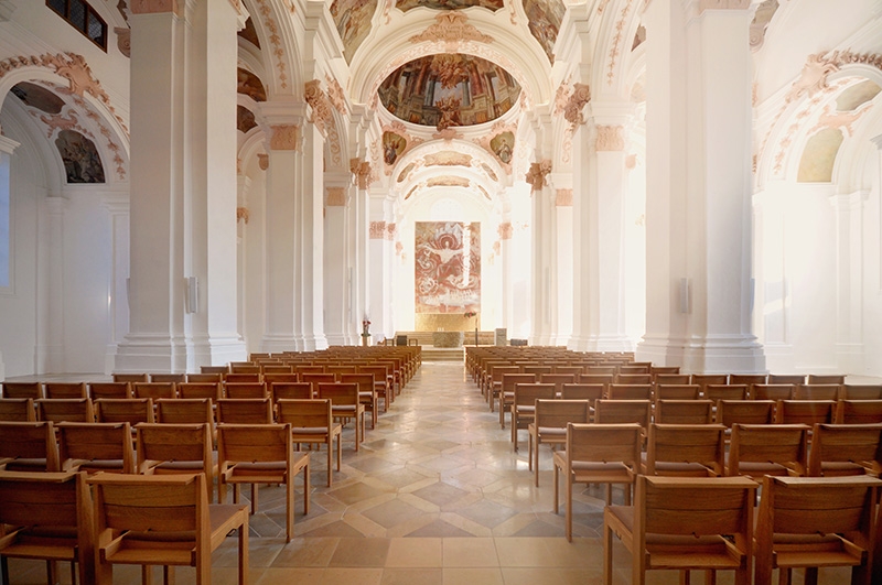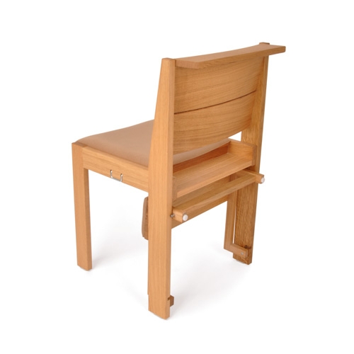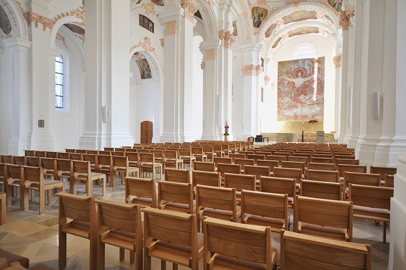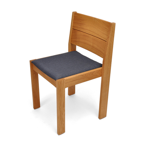 Kirchenstuhl in massiver Eiche. Ursprünglich entwickelt im Jahr 2016 für die Kath. Kirche St. Nikola in Passau. Produktgruppe: Stapelstühle, Holzstühle, Kirchenstühle