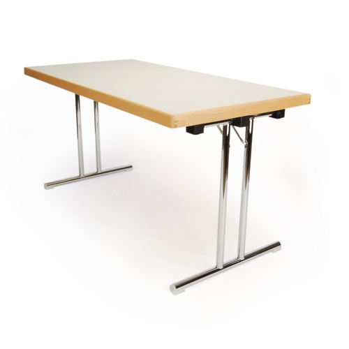 T-Fuß-Klapptisch mit Chromgestell, Tischplatte mit Massivholz-Kante